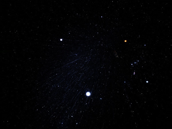 天狼星是地球上夜空里最亮的恒星,目视星等为-1.5等。天狼星是大犬座的α星,是北半天球中全天最亮的一颗恒星。天狼星是由甲、乙两星组成的目视双星:甲星是全天第一亮星,属于主星序的蓝矮星,是比太阳亮二十三倍的蓝白星,体积还略大于太阳,温度则比太阳高得多;乙星一般称天狼伴星,是颗白矮星,质量要比太阳稍大,而半径却比地球还小,它的物质主要处于简并态,平均密度约3.8×106/立方厘米。甲乙两星轨道周期为50.090±0.056地球年,轨道偏心率为0.5923±0.0019。